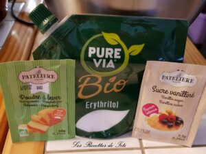 Merci aussi à mes partenaires @lapateliere pour la poudre à lever bio, le sucre vanillé saveur intense et, @purevia_fr pour l’erythritol de sa gamme Bio.