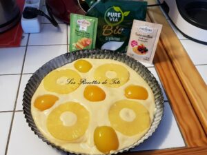 Merci à mon ami Olivier alias @songefeu sur Instagram, pour sa recette des tartelettes à l’ananas, sauf que j’en ai fait une tarte ; Et comme je n’avais pas assez d’ananas j’y ai rajouté des oreillons d’abricots.