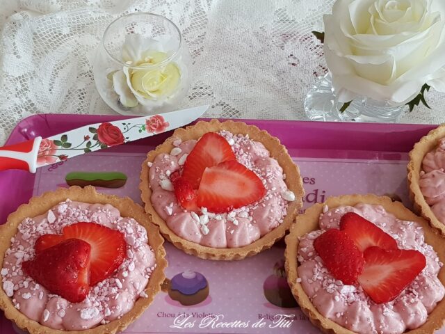 - Saupoudrez les tartelettes de crumble de meringues à la fraise.
