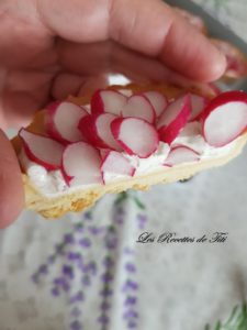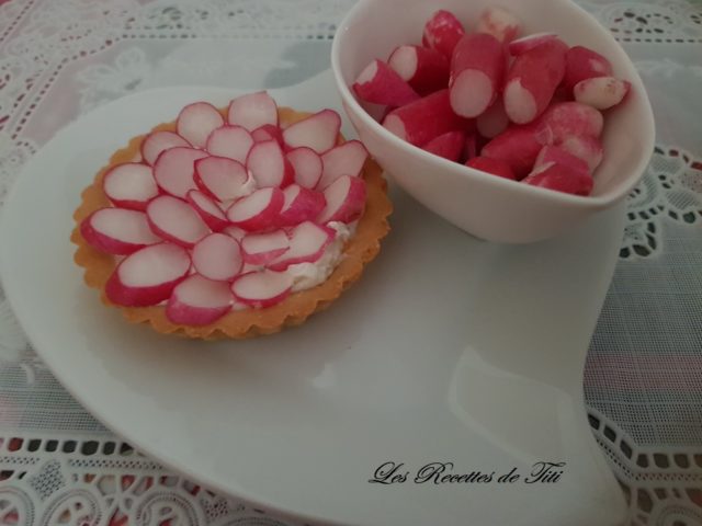 Blasée des radis au beurre salé, j’ai voulu innover un peu, comme d’hab quand je fais de la « pastrouniache » (mot de maman désignant un mélange improbable), donc j’ai osé ouiii je l’ai fait, quelques tartelettes sablées de mon Partenaire Prêt à garnir, mon ingrédient mystère, mes radis et hop le tour était joué.