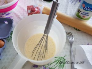 - Mélangez au fouet vitesse moyenne jusqu’à ce que le mélange blanchisse.