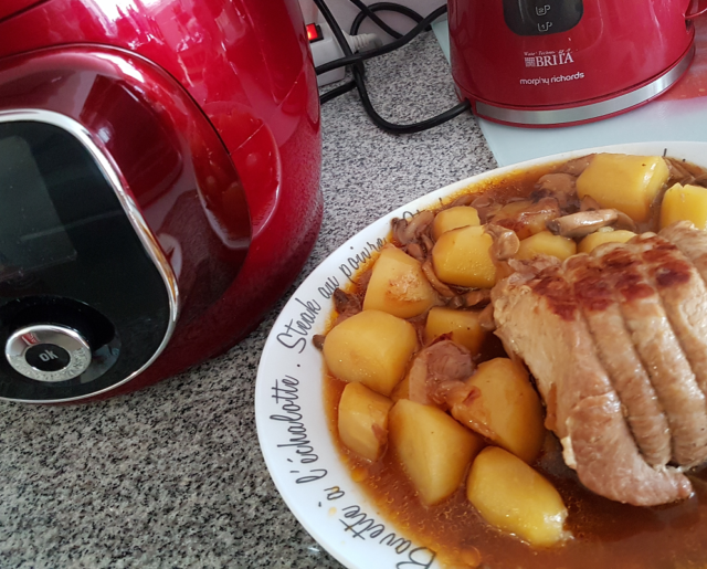 Voila j’ai inauguré mon tout nouveau cadeau, mon Moulinex Cookeo Rouge+ et j’ai l’ai testé en réalisant un rôti de porc accompagné de pommes de terre et de champignons que j’ai trouvé sur le site Cuisine A à Z.