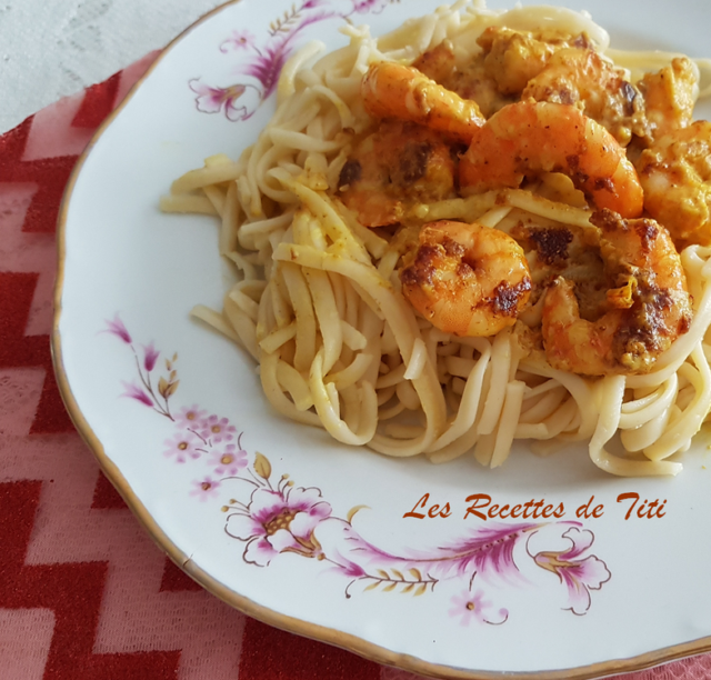 - Dans une assiette disposez une part de spaghettis et posez les crevettes à la crème de curry dessus.