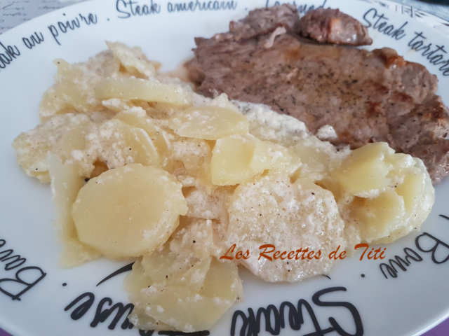 J’ai servie ces pommes de terre avec une entrecôte mais vous pouvez très bien l’accompagner avec des œufs sur le plat ou du poisson pourquoi pas ! A vous de composer selon vos goûts !