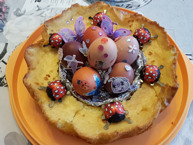Me basant sur une recette trouvée sur un livre de la grand-mère à mon compagnon, j’en ai fait un nid de pâques version « moyens du bord ». Le résultat est plutôt pas mal et le biscuit très bon et aérien.