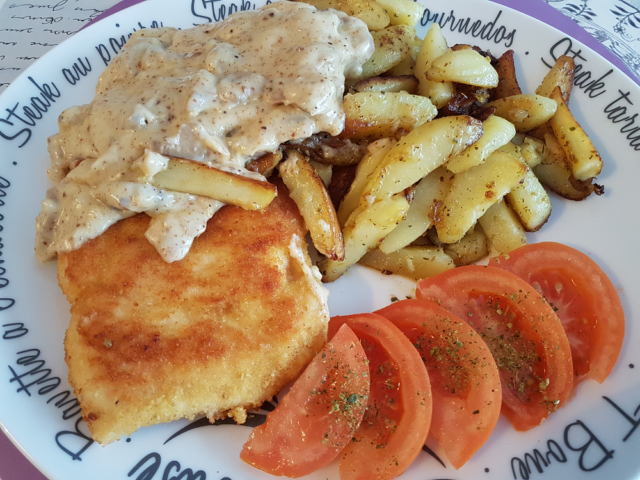 Accompagnez, pourquoi pas, comme je l’ai fait, d’une tomate coupée en rondelles et de pomme de terre rôties. (ou à votre choix bien sur !)