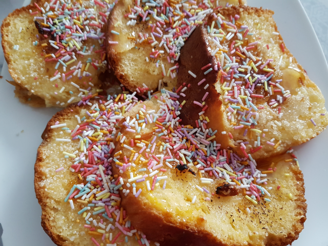 Comme il me restait un petit bout de brioche j’ai eu une folle envie de brioche perdue… Pour que ce soit plus léger, je l’ai cuite au four.