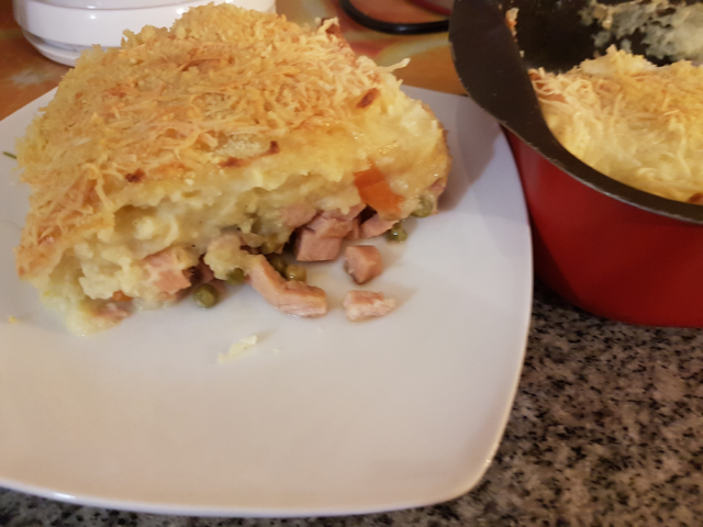 Comme il me restais des tranches de rôti en croûte j’ai récupéré la viande que j’ai coupé en tout petits morceaux pour en faire un parmentier.