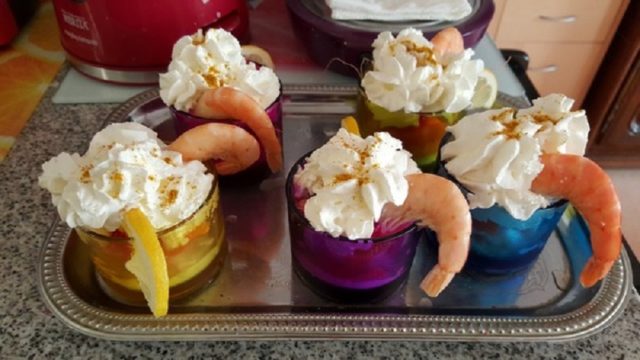 - Juste avant de servir, ajoutez la chantilly à l’aneth et décorer d’une demi tranche de citron et une crevette entière.
