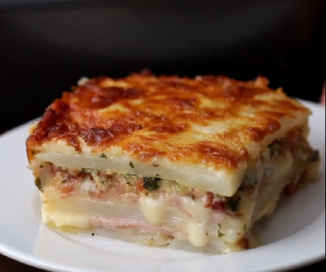 - Ajoutez une autre couche de pommes de terre, puis le jambon restant et le fromage en tranches.