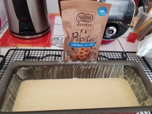 Hier mon amie Sandrine (alias Fraise Maillon) m’a envoyé son gâteau au pépites de chocolats… il m’a donné tellement envie que je lui ai demandé la recette.
