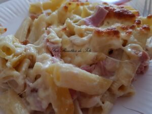 Un repas vite fait mais excellent : gratin de penne au jambon et fromage à pizza.