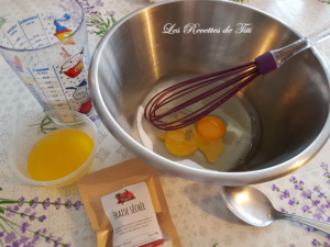- Dans un saladier mélangez les œufs et le sucre jusqu’à ce que le mélange ai blanchi et doublé de volume.